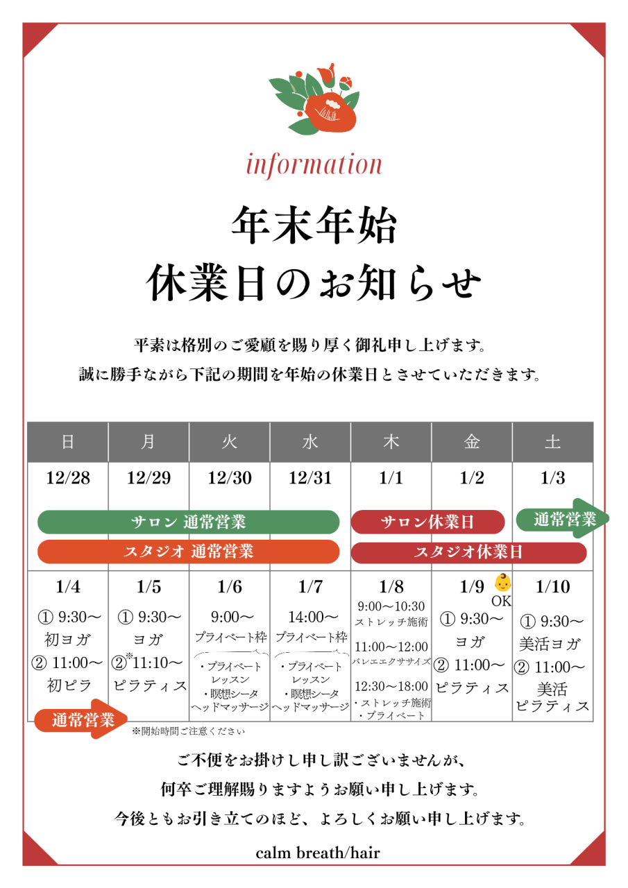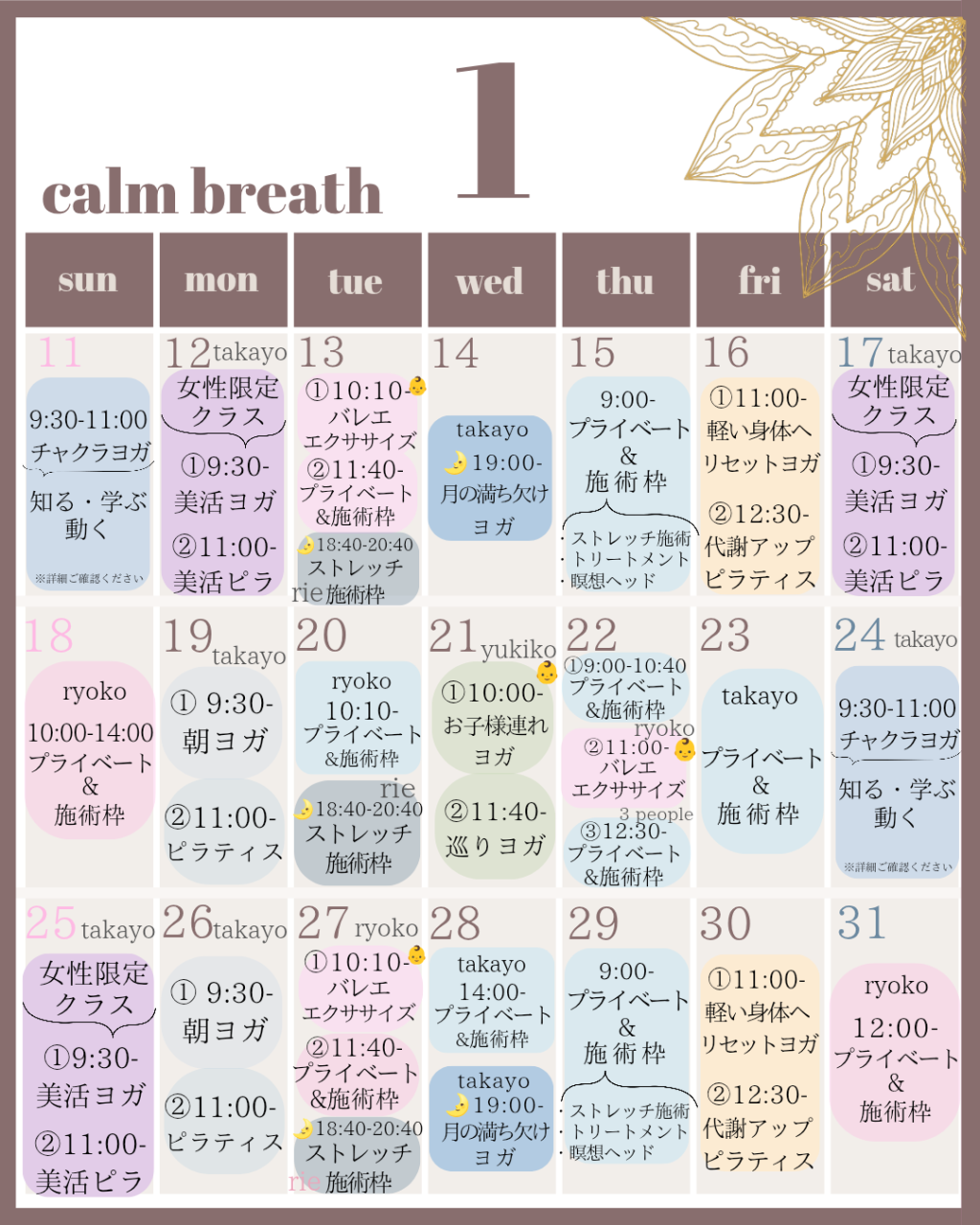 | 13:00~ | ビギナー | リラックス | ビギナー | スペシャル | スペシャル | ビギナー | マスター |